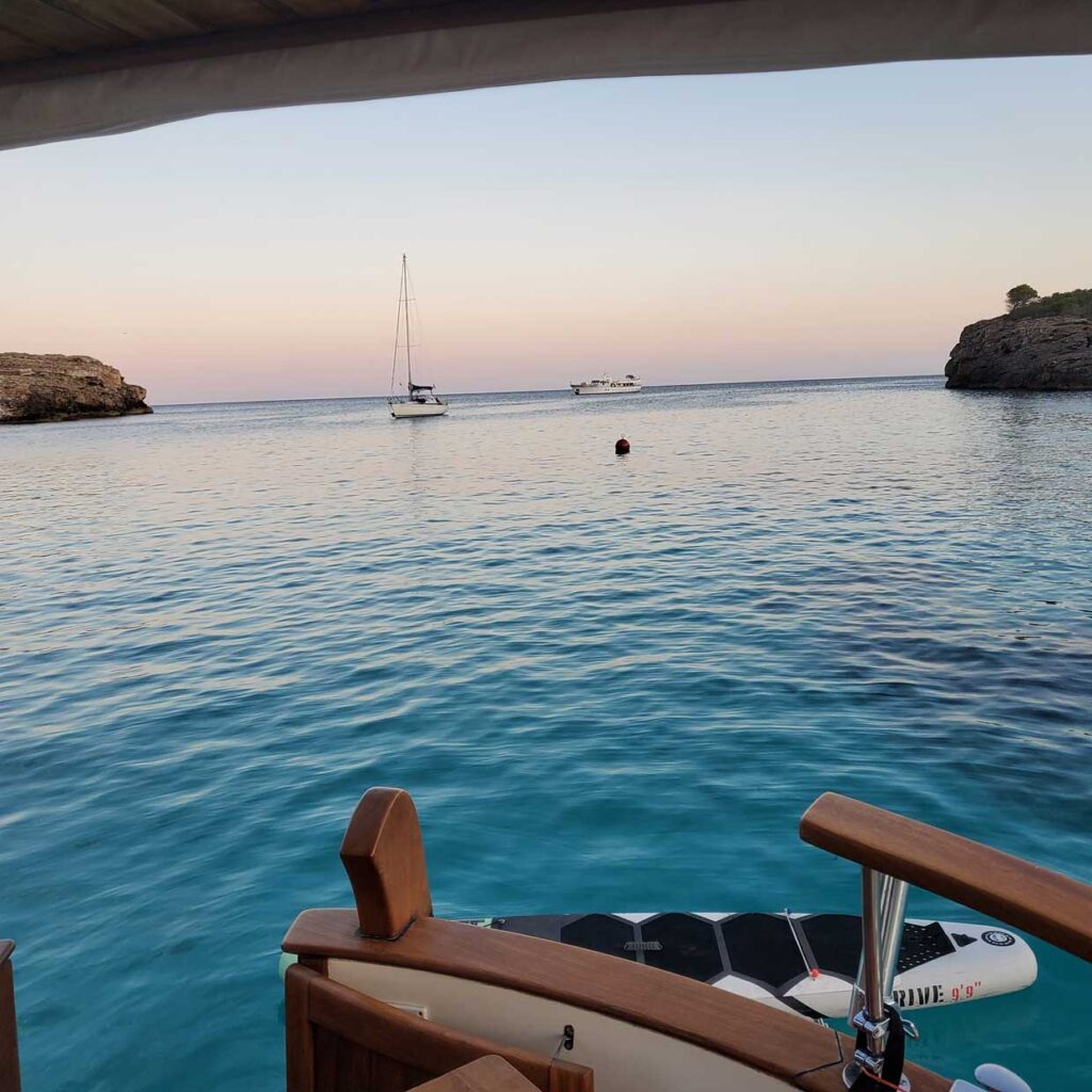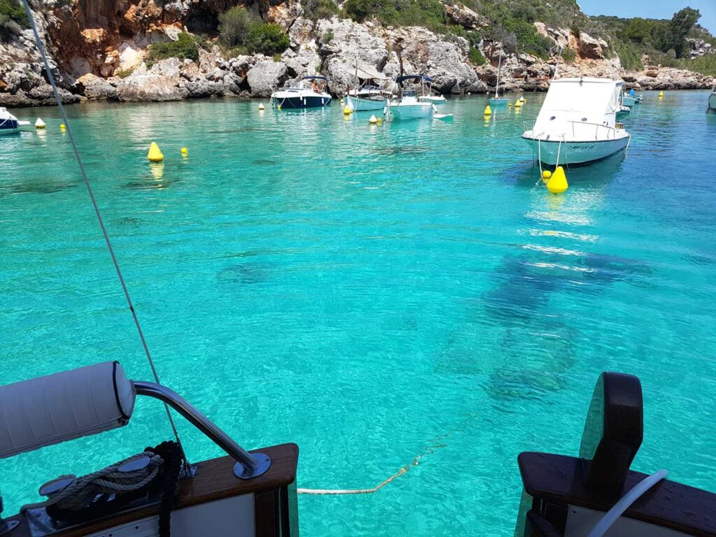 Fondear en Cales Coves es como entrar en un santuario natural y arqueológico. El lugar es silencioso, solemne, y la atmósfera cambia: se siente el peso del tiempo y la calma absoluta del entorno. Eso sí, conviene llegar temprano, ya que el espacio es reducido y está muy protegido. Es una de nuestras preferidas. Pasar la noche en esta la cala es un habitual en nuestra ruta por la isla.