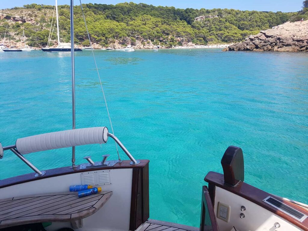 La primera joya es Cala Turqueta, fiel a su nombre. El color del agua sorprende incluso desde el barco: turquesa eléctrico, transparente hasta el fondo. Rodeada de un denso pinar, con arena blanca y fina, Turqueta es uno de los fondeos más codiciados. Por eso, en temporada alta, conviene llegar muy temprano o a última hora del día para encontrar espacio y disfrutar con tranquilidad.