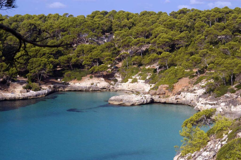 Al doblar el extremo suroeste de Menorca tras dejar Ciutadella atrás, la costa cambia radicalmente. Se deja atrás la piedra áspera del norte y se entra en un mundo de acantilados blancos, pinares frondosos y aguas de un azul increíble. Aquí están las calas más icónicas, las que suelen ilustrar postales, reportajes y sueños de verano.
