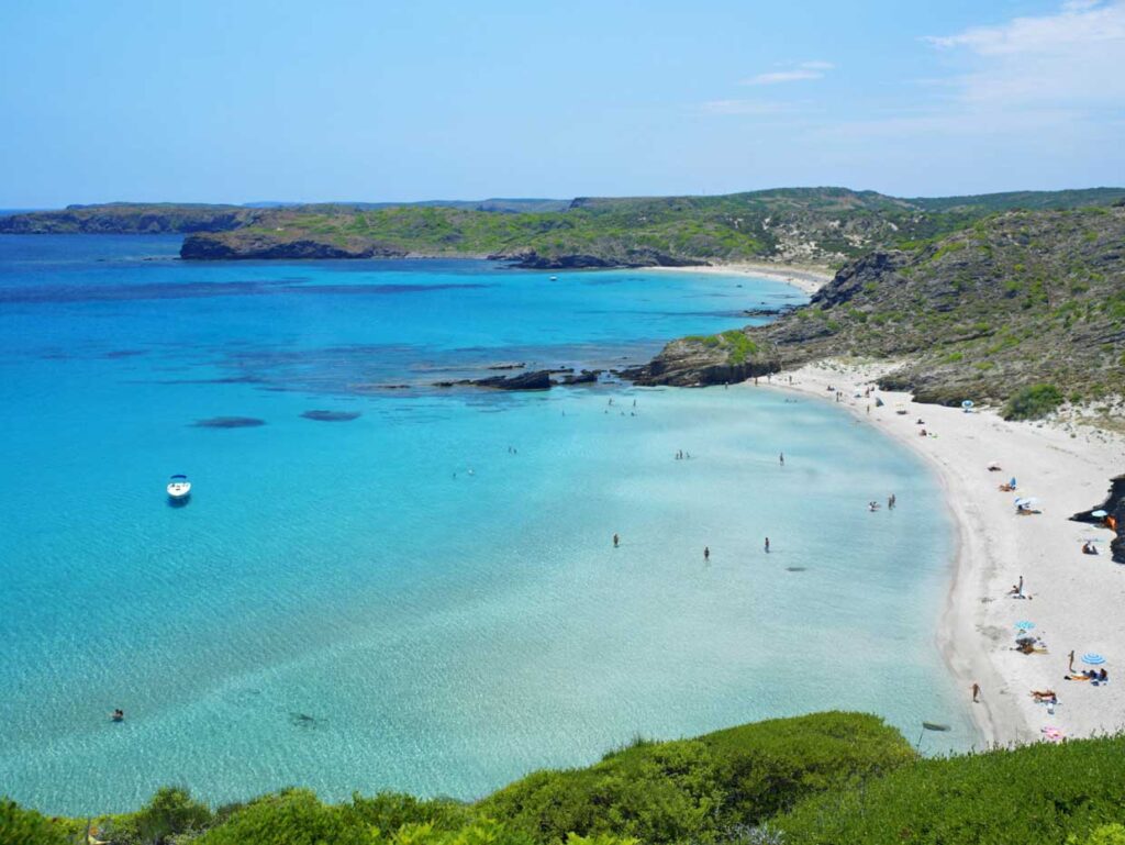 Desde aquí, la ruta sigue hacia el sureste, con playas más largas y abiertas como Binigaus, Santo Tomás y Son Bou, antes de encarar el regreso hacia Mahón.