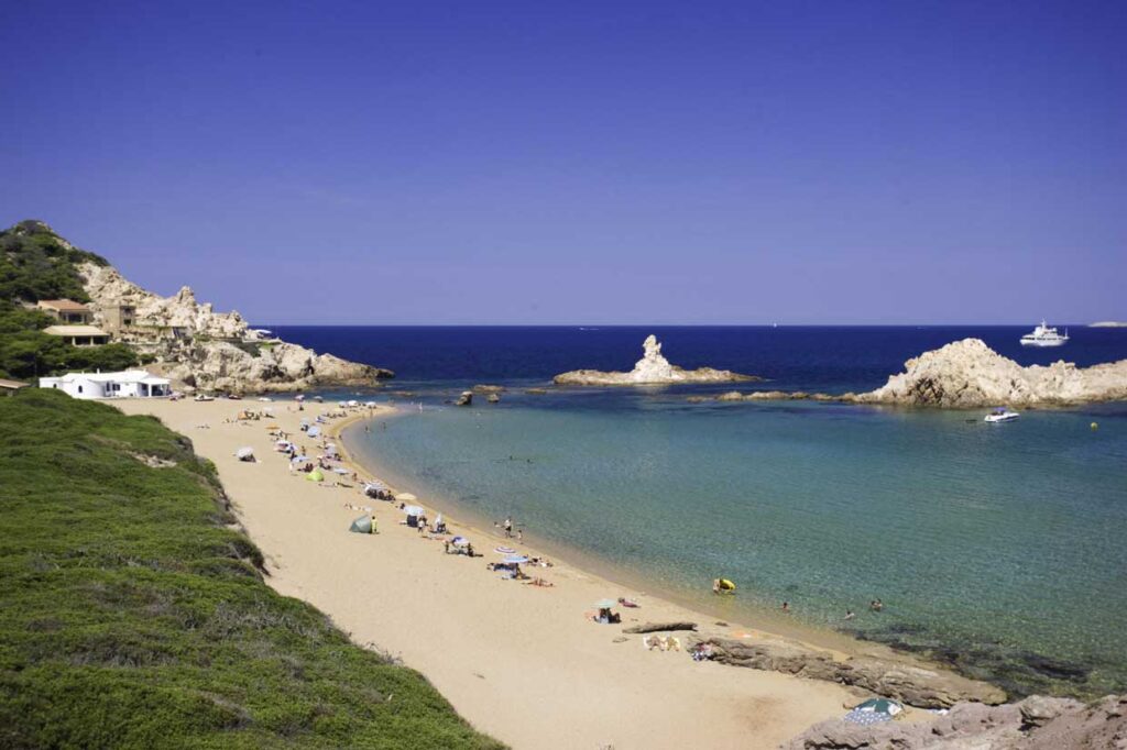 A su lado se esconde Cala Mitjaneta, una diminuta cala entre rocas que, si bien es estrecha para fondear, invita a explorarla con tabla o nadando. Ambas forman parte de una zona muy querida por los menorquines y menos saturada que las calas anteriores.