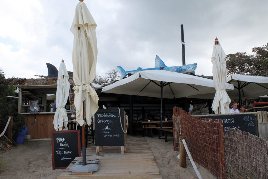 Según empezamos a caminar nos encontramos con el chiringuito “Sa Segui”, seguido de “El Tiburón”, y mas allá el magnífico restaurante “El Molí de Sal”. Y ya casi al final de la manga el restaurante de Juan y Andrea en el que podemos disfrutar de un delicioso arroz entre fina arena y palmeras.