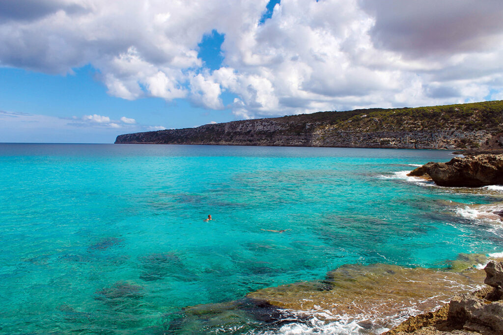 De regreso paramos en Es Caló de Sant Agustí. Un pueblo de pescadores muy bien conservado, donde las piscinas naturales de aguas turquesas, luminosas y transparentes, hacen las delicias de todo bañista. Un buen lugar para practicar el snorkel, ya que hay rocas, y muy buen puerto para saborear frescos pescados en alguno de sus restaurantes cara al mar.