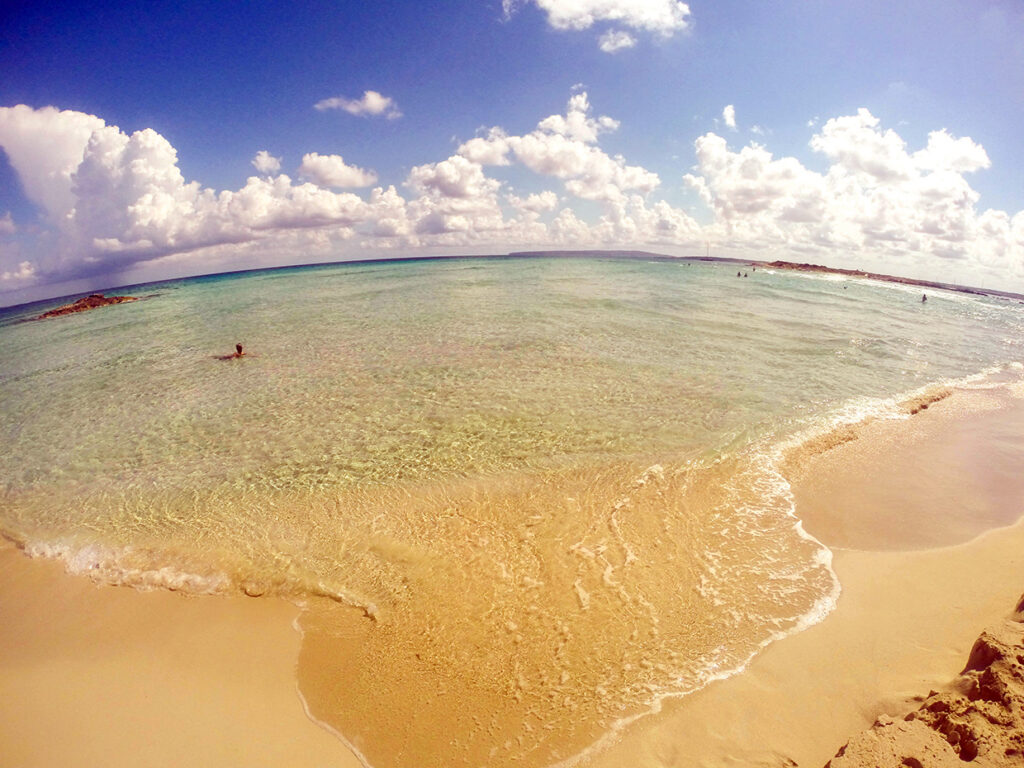 El ultimo día dimos la vuelta hacia la cara este de la península de Es Trocadors, la Playa de LLevant. Si miráis un mapa se encuentra al otro lado de la playa de Illetes. Es un largo arenal donde descubrir muchos rincones solitarios. También podemos encontrar en esta zona algún quiosco o chiringuito como el famoso “Tanga”.