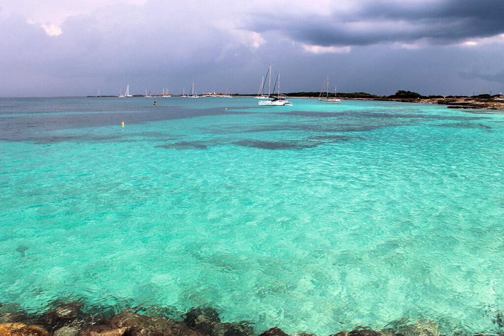 Hay que tener en cuenta que en época estival en La Savina no es fácil conseguir amarre y los amarres de paso no se permiten. Atracamos en la zona de levante donde para nuestra sorpresa comienza una de las playas más bonitas de la Isla, Ses Illetes.
