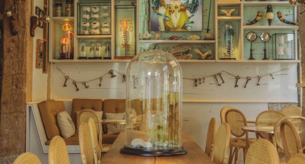 Raro Rare, situado en un edificio clásico del siglo XIX frente al Museo de Historia de Madrid y al parque de Tribunal, simula un gabinete de curiosidades donde colecciones de lo más variopinto decoran las paredes y las estanterías. Objetos “raros” de otra época y creaciones asombrosas: bastones, polvoreras, frascos de farmacia, corales, mariposas, langostas… componen todo un universo onírico. Y como protagonista, una pintura de la diosa Era, que preside el salón con su mirada y sus animales fantásticos.