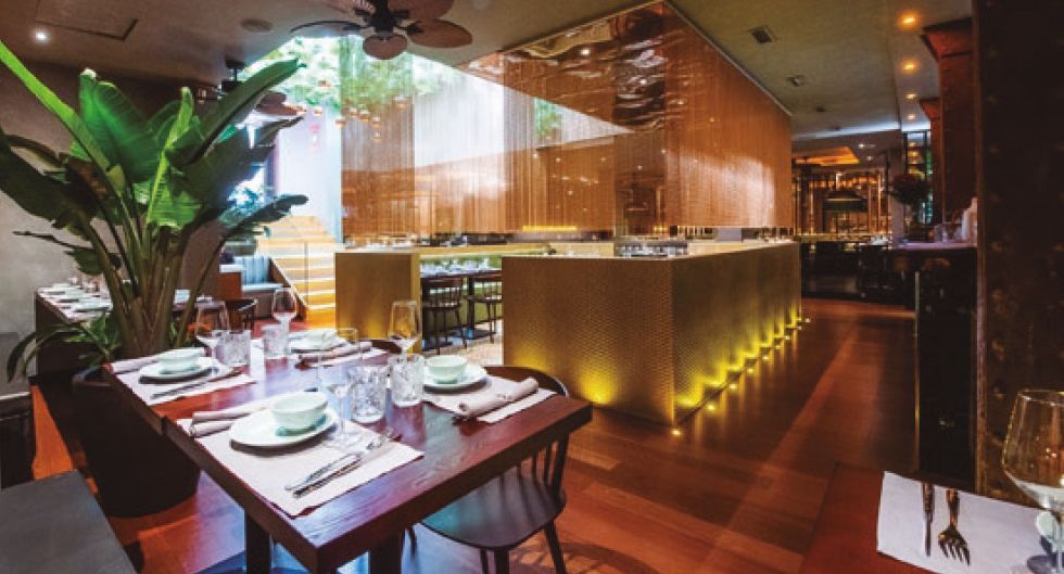Destacan las mesas de la zona central, que dan la bienvenida al bajar la escalera principal tras pasar la luminosa claraboya, delimitadas por una preciosa lluvia de finas cadenas doradas. Al fondo hay un rincón más íntimo con tres mesas redondas que cuentan con cierta independencia, separadas entre sí por sutiles cañas de madera. Una forma de ‘evadirse’ del resto sin necesidad de aislarse.