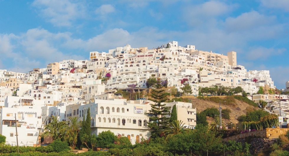 Mojácar impresiona desde la lejanía. La majestuosa amalgama de blancas casas, arremolinadas y colgadas de la última estribación de la Sierra de Cabrera, se muestra imponente al viajero. Luego, una vez dentro del laberinto se descubre una belleza más íntima entre sus calles estrechas, adornadas de flores de intensos colores que resaltan en el blanco de sus casas y el intenso azul del cielo almeriense.