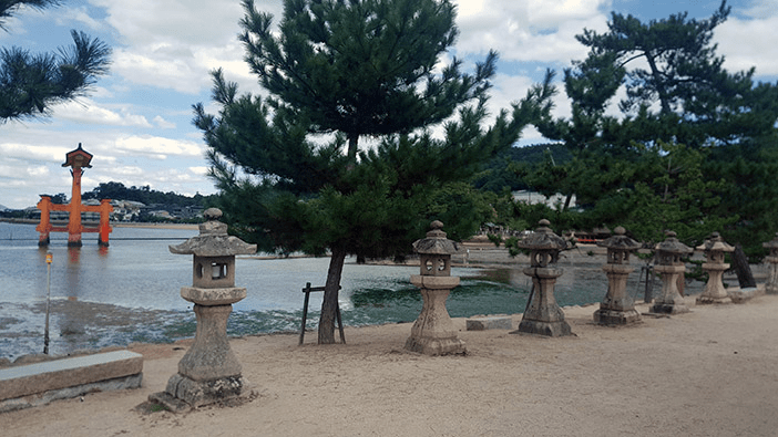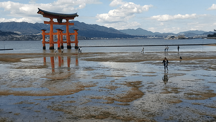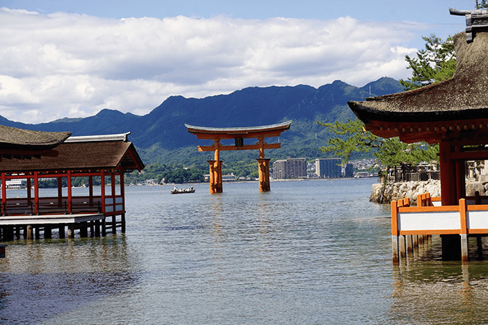 Conocida popularmente como Miyajima, Itsukushima es una isla ubicada dentro de la Bahía de Hiroshima. Siempre ha sido un lugar sagrado, pues en el año 593 se estableció allí el célebre Santuario de Itsukushima, que se halla a unos 12 minutos desde la terminal del ferry. Este Santuario, Patrimonio de la Humanidad, y su gran torii son símbolo de la isla. El santuario mantiene el estilo arquitectónico Shinden, típico del periodo Heian de la historia japonesa (de los años 794 a 1185) y se compone de un templo principal y varios secundarios que se están conectados por puentes y galerías.  Lo que le hace bello es que está parcialmente construido sobre el agua, ya que está dedicado a la diosa guardiana de los mares. El grandioso torii bermellón, es la entrada al santuario que se encuentra a unos 200 metros. Con la marea alta parece flotar sobre las aguas. Es posible acceder a su base, a pie, cuando baja la marea. Es algo fantástico y un lugar inolvidable, en especial con la luz del atardecer.