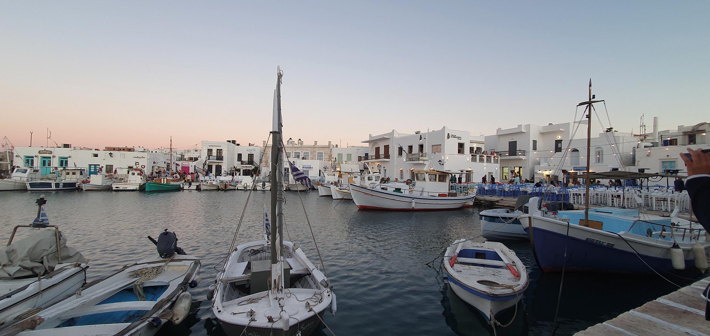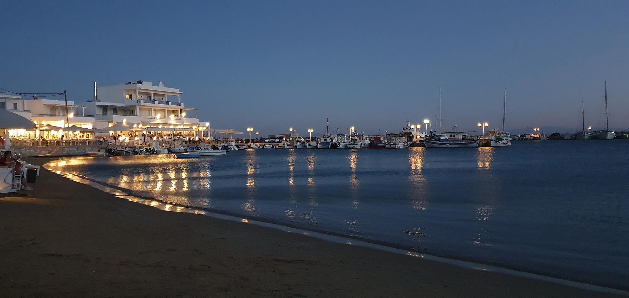 Cenamos en Naoussa, un pueblo tradicional marinero que se ha convertido en un lugar de moda. Es conocido como el mejor sitio de la isla para ir de compras y disfrutar de buenos restaurantes. De día es muy tranquilo, pero de noche se transforma con animadas terrazas junto al mar.