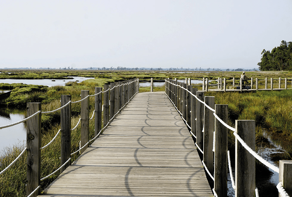 Se trata de un conjunto de 7 Km de senderos y pasajes de madera instalados sobre la Ria de Aveiro. Pedaleamos sobre los juncos, atravesamos pequeñas lagunas, puentes y caminos arbolados de grandes helechos. Viejas barcas varadas decoran el panorama presentando un bucólico paisaje para la contemplación y el relax. “Las Pasarelas” o “Pasajes” de Aveiro son el lugar perfecto para explorar parte de la Ría, un extraordinario ecosistema rico en aves y vegetación. Este lugar es un imprescindible y fue una experiencia memorable. Mejor en bicicleta y al atardecer.