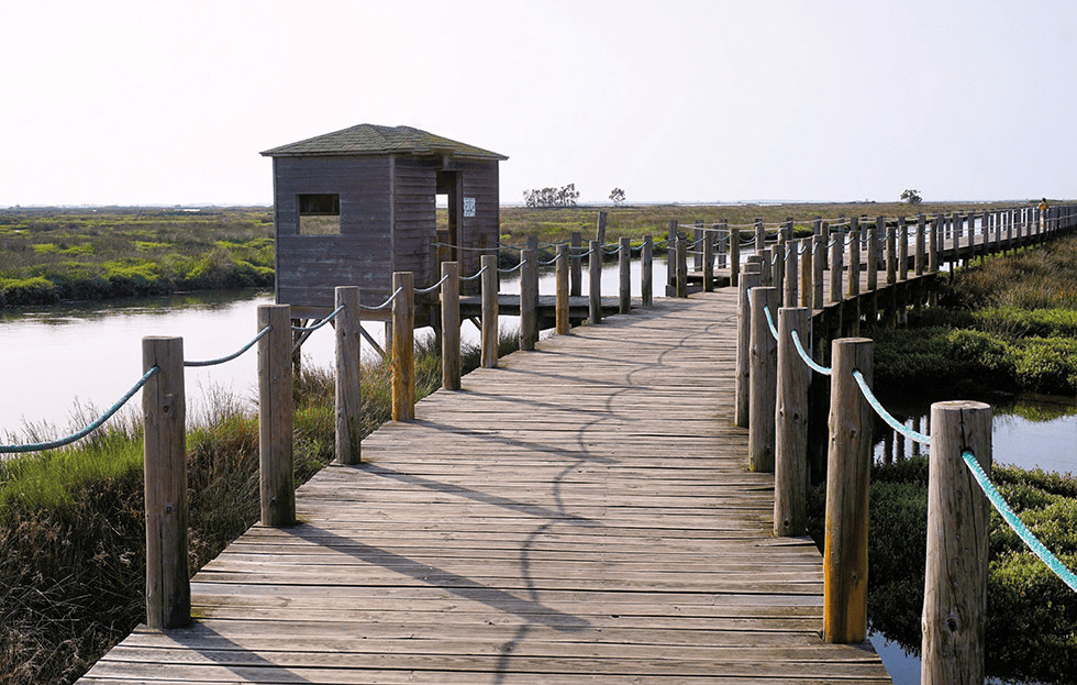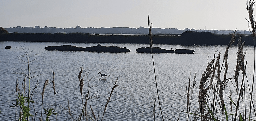Volvimos al hotel disponiendo de las bicis de nuevo, dejándonos llevar esta vez, por lugares que no habíamos transitado, como el pequeño canal del barrio do Alboi, que nos conduce a un inesperado y novísimo carril bici que recorre toda la zona de la Universidad frente a la ría. Un largo camino con espacios para sentarse a observar las aves recreándose en el agua lagunar, entre las que distinguimos elegantes flamencos. En el último tramo, tomamos un sendero de vegetación que transcurre entre una parte de las salinas. En esta ocasión observamos más cantidad de aves que no identificamos. Una maravilla paisajística en la que solo faltó, por coincidir con la época de recogida, el blanco panorama que dejan las pirámides de sal almacenada, otro símbolo de la localidad. Un bellísimo y tranquilo atardecer y todo un regalo de despedida. Sin lugar a duda, pasear en bicicleta por esta agraciada localidad es una de las mejores cosas que pudimos hacer.