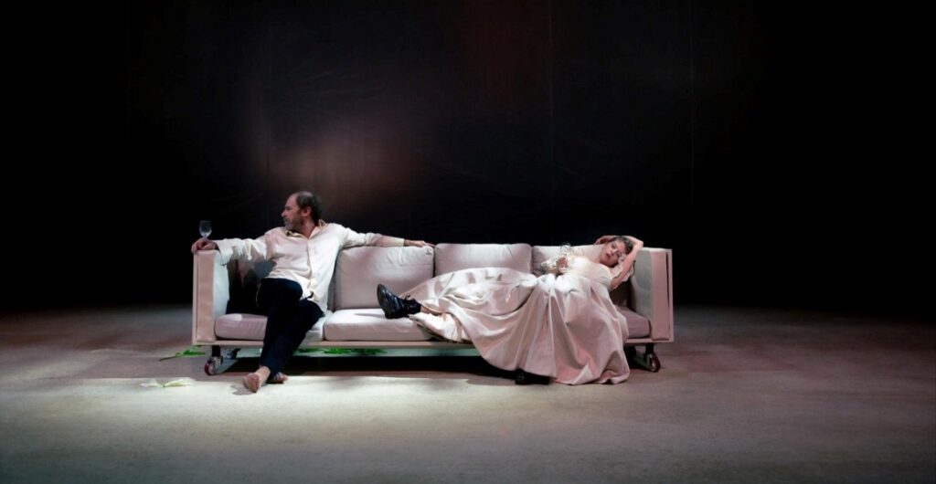 La adaptación del texto llevada a cabo por Michael De Cock condensa la acción en dos únicos personajes, el matrimonio fallido formado por Emma Bovary -interpretada por Maaike Neuville, actriz muy reconocida por su trabajo en teatro, cine (con producciones internacionales y recientemente como directora de premiados cortometrajes y preparando su primer largo) y televisión- y Charles Bovary, a quien da vida Koen De Sutter, con una larga carrera en la escena belga como intérprete y director.