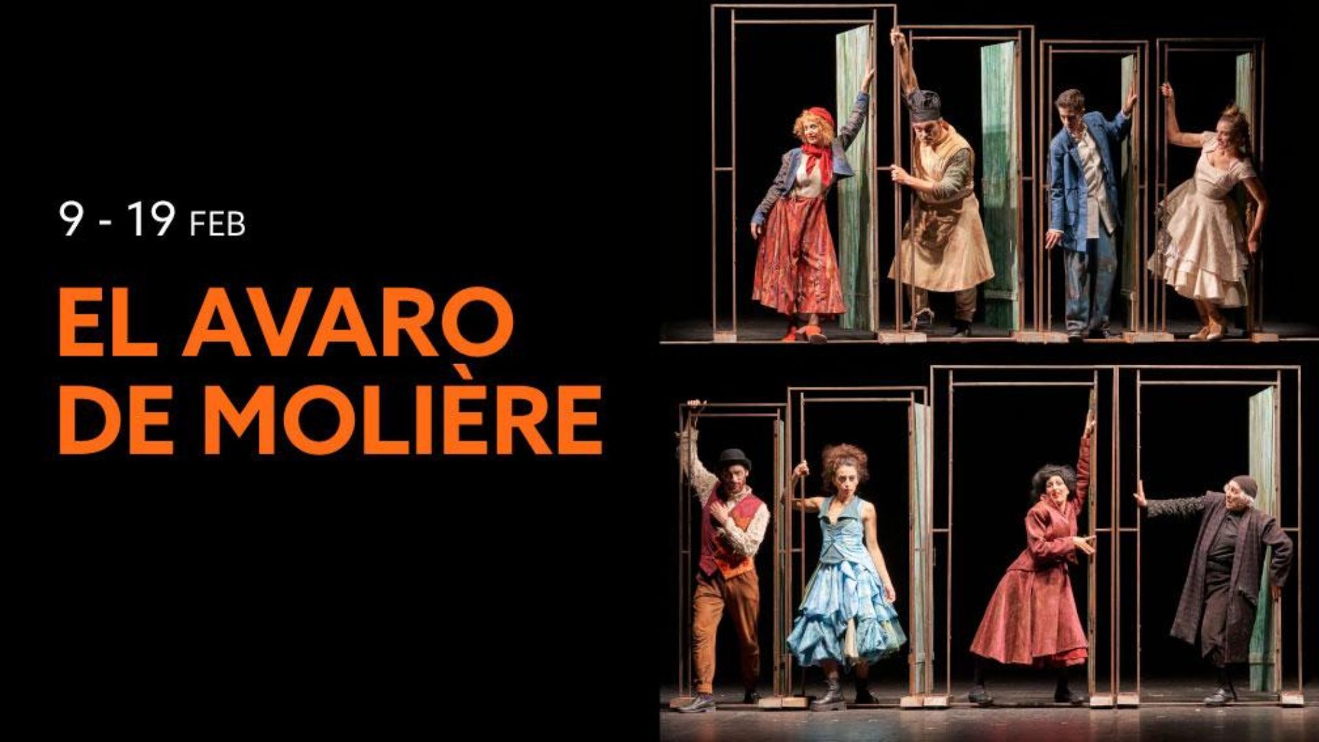 “El coro musical, que no son otros que los criados, supone un contrapunto, no sólo en la partitura sonora, sino en la propia concepción del espectáculo, al establecer “nudos” que van apareciendo a lo largo del montaje, creando una dramaturgia paralela a la del propio texto del autor, lo que enriquece la percepción del espectador. La idea escenográfica gira en torno a las puertas, puertas que provocan sonidos inquietantes o estruendosos, a veces rítmicos… Puertas por las que mirar por la cerradura, puertas cerradas bajo numerosos cerrojos (tras las que se esconde Harpagón y ante todo él oculta su tesoro), puertas que se abren para que escape la hija de Harpagón, puertas que los criados y el coro musical convierten en un laberinto tras el que se ocultan o por el que aparecen. La música, casi siempre interpretada en vivo por la orquestina, imprime al espectáculo un ritmo que mantiene de principio a fin enganchado al espectador, tanto por los acordes como por las letras de las canciones que interpretan las actrices y actores. Más de una veintena de temas burlones, con alguna ruptura más contemporánea”, explica.