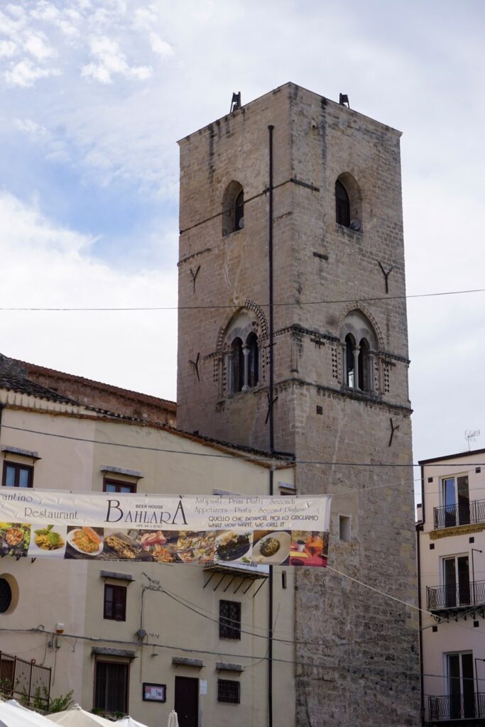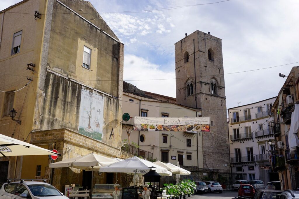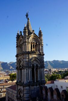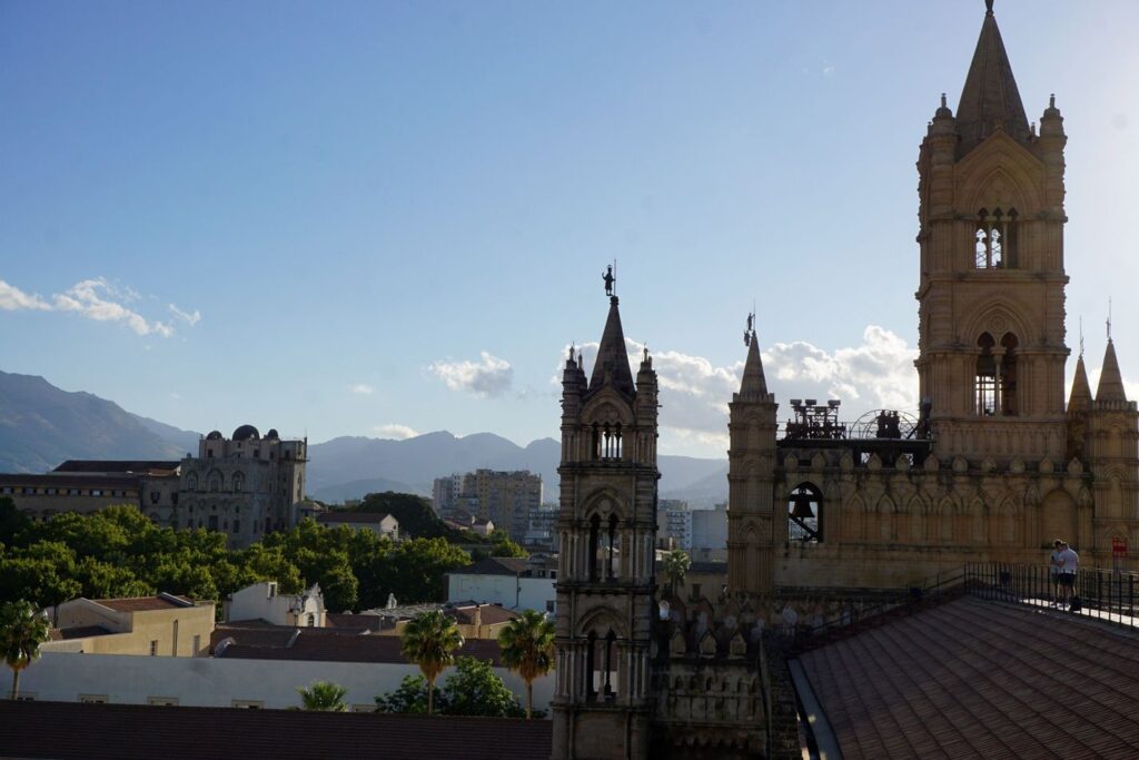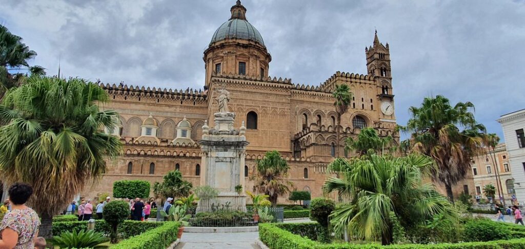 Una vez en el exterior, nos trasladamos hasta a la Plaza de la Victoria, donde se encuentra la Catedral de Palermo o Basílica de la Virgen de la Asunción. Construida alrededor del año 1185 por el arzobispo Gualtiero Offamilio, su excepcionalidad radica en el hecho de poseer una mezcla de diferentes estilos arquitectónicos tras diferentes fases históricas, que la hacen única en su género. Originalmente era un templo dedicado a Virgen María (año 604) que se transformó en mezquita tras la conquista árabe (año 831) para retornar a un edificio de culto cristiano tras el asentamiento de los Normandos (1072). La extraordinaria armonización y combinación de estilos tan dispares es admirable. El llamativo Pórtico con tres arcos ojivales, es una obra maestra del estilo llamado gótico florido por su riqueza decorativa.
