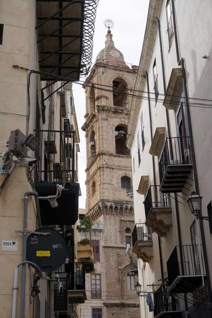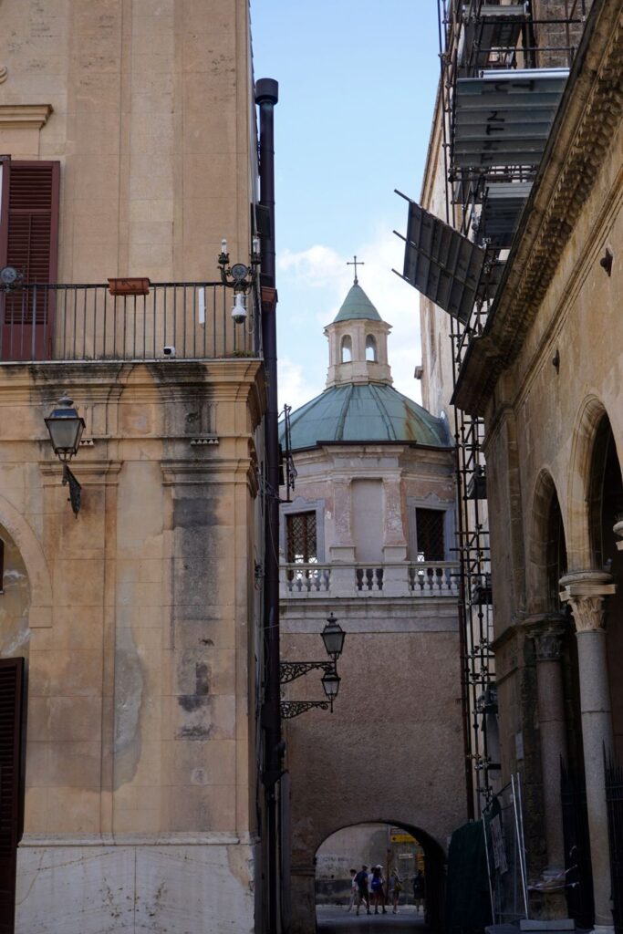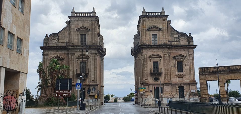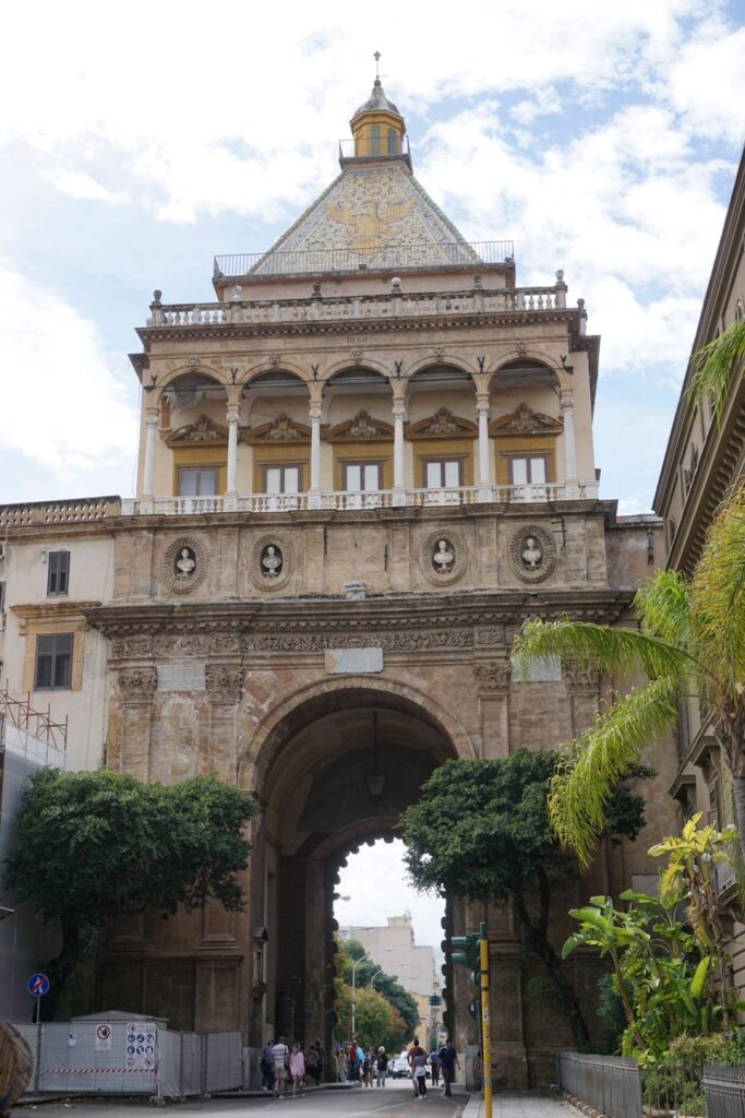 El carril bici nos llevó hasta una de las puertas de entrada a la ciudad, la monumental Porta Felice, aduana en el siglo XVI, que conduce a la calle principal y la más antigua del casco histórico, la Via Vittorio Emanuele. Esta avenida de 2 kilómetros de longitud atraviesa en línea recta todo el casco viejo hasta la otra de las puertas de la ciudad, la Porta Nuova (siglo XV), conectando ambos umbrales. La Porta Nuova está unida a la estructura del célebre Palacio Real o Palacio de los Normandos, siendo una de los construcciones más fotografiadas y representativas de Palermo. En la fachada podemos ver el águila, emblema municipal de la ciudad.