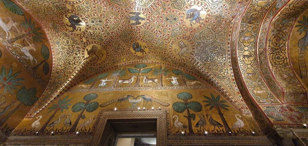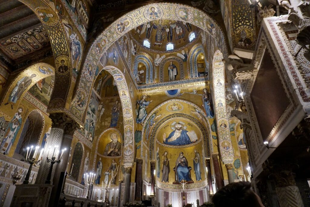 El día siguiente nos desplazamos en patinete hasta la Porta Nuova, anexa a El Palacio de los Normandos, actualmente sede del Parlamento Siciliano y uno de los puntos principales en la visita a Palermo. Su estructura irregular se debe a las transformaciones a lo largo de los siglos. Está catalogado como bien artístico-monumental de la arquitectura árabe-normanda que data de la época de la dominación normanda en la isla (1130-1194). Patrimonio de la Humanidad por la Unesco fue construido sobre los cimientos de un palacio árabe. En su interior se encuentra uno de los tesoros de Palermo: la Capilla Palatina, la capilla real de los reyes normandos. Una obra maestra de los musulmanes que en 1143 confeccionaron el extraordinario artesanado con figuras e inscripciones cúficas. Construida por Roger II en 1192 como la capilla real, se halla totalmente revestida de abrumadores mosaicos de fondo de oro. Un espacio que, sin ninguna entrada de luz natural, ostenta una gran luminosidad en las tres naves de las que dispone. La nave central se extiende entre columnas de mármol de diferentes colores y la cúpula alberga el espectacular Pantocrátor (representación de Cristo bendiciendo con la mano derecha). Disfrutamos incrédulas de los infinitos detalles de este impresionante espacio durante un buen rato. Una explosión de luz y color que deja boquiabierto.