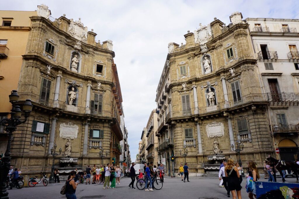 Cuando la Via Vittorio Emanuele se cruza con la Via Maqueda, nos hallamos en el mismo centro de la ciudad vieja, siendo la intersección más emblemática de Palermo, la Piazza Vigliena, en la que se levantan los Quattro Canti. En las cuatro esquinas de esta confluencia se alzan cuatro fachadas cóncavas de cuatro palacios barrocos del s.XVIII. Cada una de ellas tiene tres niveles en los que aparecen, las estatuas de las 4 estaciones, las estatuas de los reyes españoles Carlos V, Felipe II, Felipe III y Felipe IV y en el último nivel las patronas de los distritos de la ciudad (Oliva, Ágata, Ninfa y Cristina). Un monumental cruce, con cuatro fuentes kilómetro cero de Palermo. Por su forma, es difícil de fotografiarla en su totalidad. Es uno de los espacios más armoniosos y representativos.