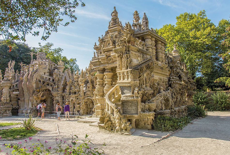 El edificio comenzó a construirse en 1879, cuando el cartero se tropezó con una piedra y al ver lo extraña que era, decidió llevársela a casa, lo que se convirtió en costumbre. Este Palacio Ideal cuenta con dos fachadas que miden 26 metros de largo cada una y se compone de 1.000 pequeños palacios, decorados con figuras animales y vegetales. Se dio por acabado en 1912, es una mezcla de varios estilos, países y épocas y está situado en Hauterives (Francia).