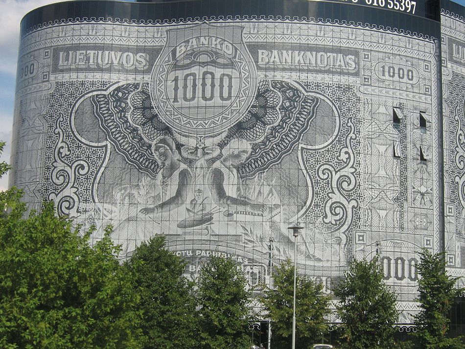En las afueras de Kaunas, la segunda ciudad con mayor población de Lituania y considerada como el centro económico del país, se encuentra el siguiente edificio singular, un bloque de oficinas diseñado con forma de billete gigante de 1.000 litas lituanas de 1926.