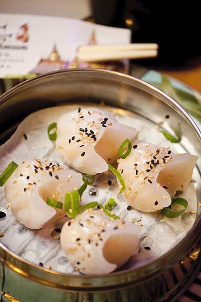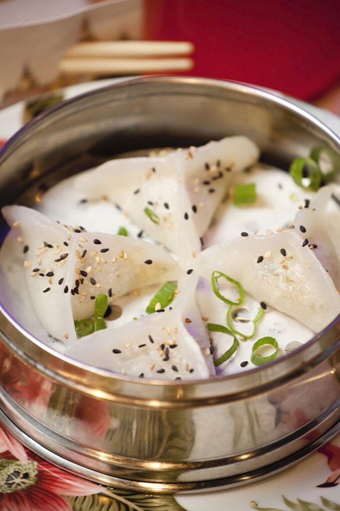 Los suculentos dimsum triangulares, que están hechos con fécula de patatas y carne, son altamente recomendables por su impactante sabor y por la facilidad a la hora de comerlos, lo mismo que las empanadillas de camarones al vapor y los dimsum rellenos de verdura. También es recomendable el pato asado, que viene acompañado de una salsa muy sabrosa, unas tortitas y de verdura pepino y cebolleta para montarlo todo y disfrutar de un excelente plato.
