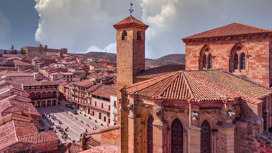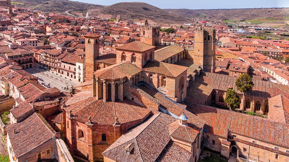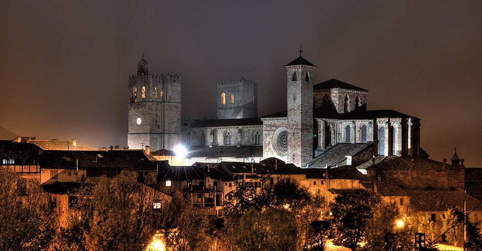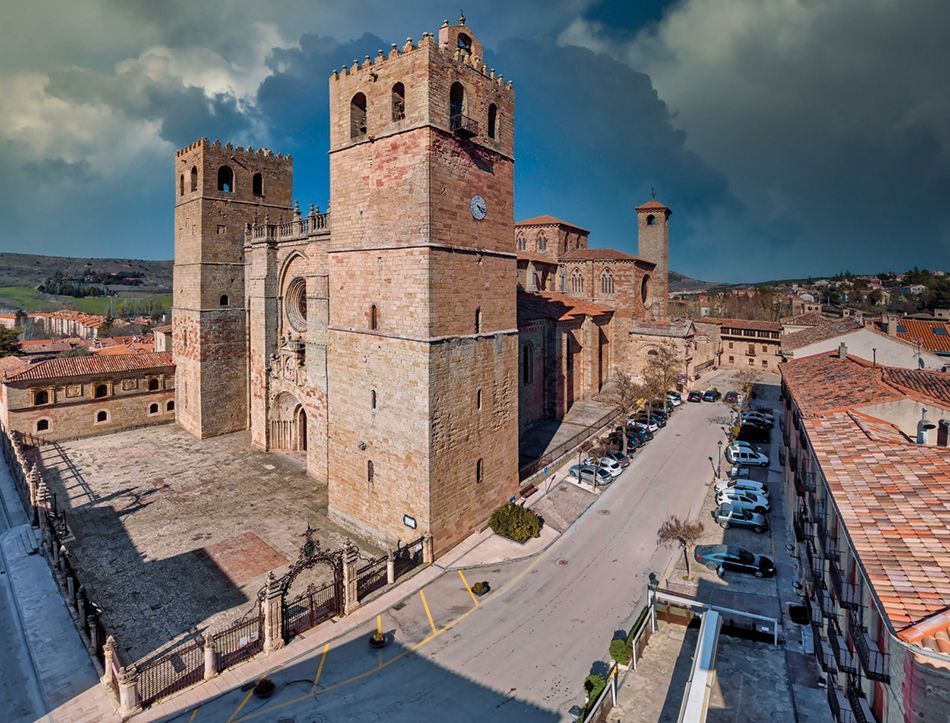Bajando por su señorial calle Mayor, y al finalizar la calle, nos encontraremos con una de las obras de mayor calado histórico y artístico, la Catedral de Santa María, sus dos grandes torres almenadas la dan ese carácter defensivo de la época, siendo además una de las pocas catedrales amuralladas, la cual guarda diferentes estilos desde el románico Cluniacense y Cisterciense, gótico, plateresco y barroco.
