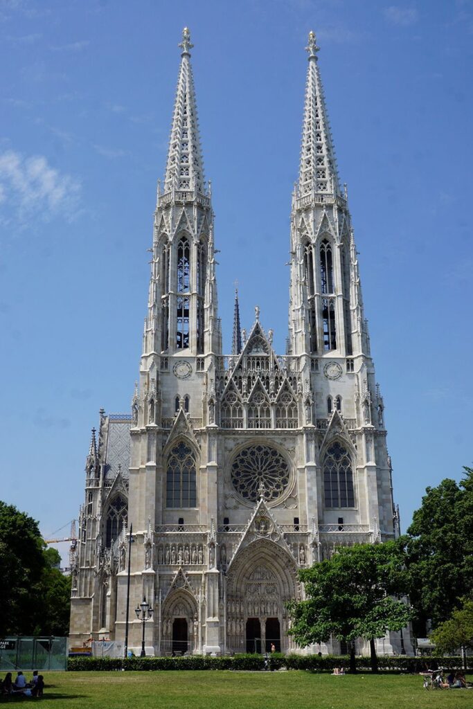 Alcanzamos la Iglesia Votiva, que de estilo neogótico, no pasa desapercibida sorprendiendo por su belleza. Es aconsejable adentrarse en los Jardines Volksgartenen. Un sorprendente parque de rosas de estilo francés, en el que la explosión de colores y el perfume de más de 3.000 rosales y 200 variedades de esta flor invitan al deleite.