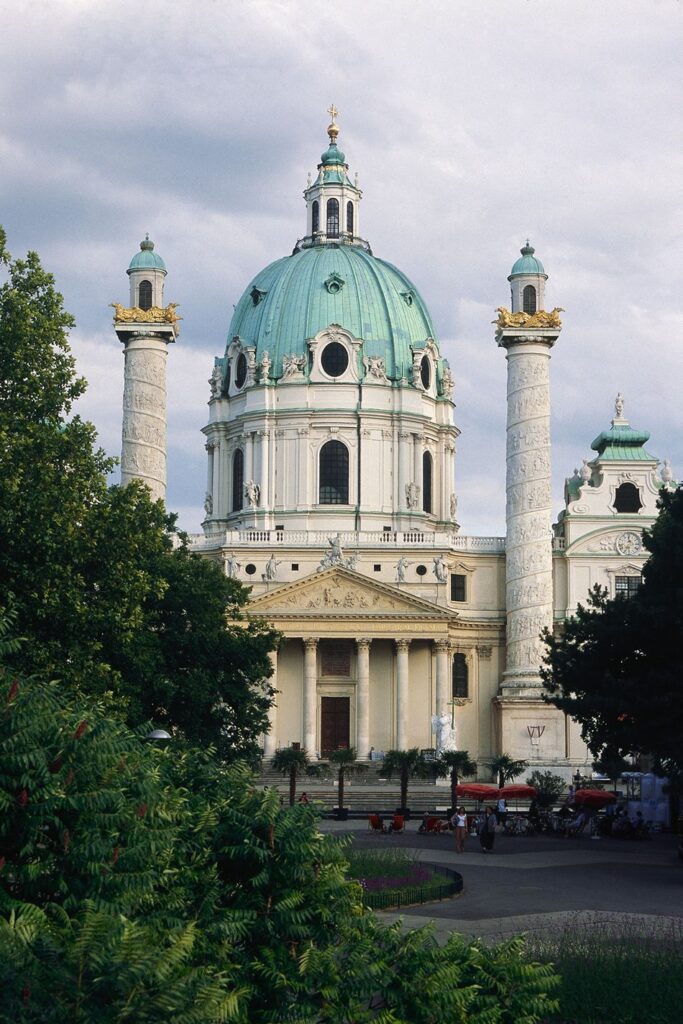 La enorme cúpula verde de la Iglesia de San Carlos que domina la Karlsplatz forma parte del perfil de Viena. Gran y última obra del célebre arquitecto barroco Johann Bernhard Fischer se terminó en 1739, realizándose como una promesa del Emperador Carlos VI durante una epidemia de peste. La iglesia está dedicada al patrón de la familia imperial de los Habsburgo, San Carlos Borromeo. Los visitantes desde la terraza exterior disfrutan de una espectacular vista sobre Karlsplatz, el Resselpark, el Musikverein y la Universidad Técnica.