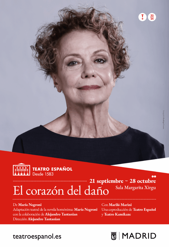 En esta ocasión, tenemos el estreno absoluto de El corazón del daño, adaptación teatral de la novela homónima de María Negroni, dirigida por Alejandro Tantanian y protagonizado por Marilú Marini. El espectáculo, que estará en cartel del 21 de septiembre al 28 de octubre en la Sala Margarita Xirgu, es el relato de una hija acerca de la compleja y singular relación que mantiene con su madre.