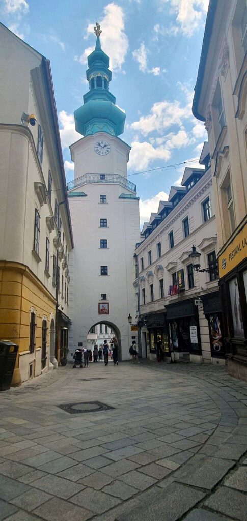 De palacios señoriales, tiendas locales y terrazas y bares, la calle peatonal Venturská nos conduce a la Puerta de San Miguel, la única puerta medieval que queda de las cuatro que tenía la ciudad para acceder dentro del recinto amurallado. Esta torre cuadrada es originaria del siglo XIV y marca el kilómetro cero de Eslovaquia, tal y como lo señala una inscripción circular con que indica la dirección y distancia a las capitales de otros países. Está rematada por el santo que le da nombre y acoge la exposición de armas y restos medievales del Museo Municipal. Se puede subir a la torre, de 51 metros desde la que se obtiene una buena panorámica del centro histórico. Hay una leyenda que dice que «si pasas hablando por debajo de la Puerta de San Miguel, morirás en un año y un día», así que ya sabéis… a cruzarla calladitos… por si acaso…