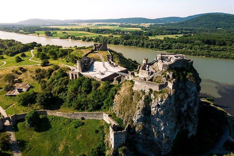 A 13 Kilómetros de Bratislava, se encuentra uno de los lugares arqueológicos más significativos de Eslovaquia, las ruinas del Castillo de Devín. Este gran museo al aire libre data del S.VIII, como punto estratégico del Reino de Hungría. En el S.XIII pasó a ser propiedad de familias de gran linaje y en 1890 fue destruido por orden de Napoleón. Erigido en lo alto de una peña, es un lugar excepcional debido a su posición geográfica en la confluencia de los ríos Danubio y el Morava en un entorno de verdes parajes. Una visita que resulta un agradable paseo histórico que permite disfrutar de privilegiadas vistas. Destaca una torre con una almena conocida como “Torre de la Virgen” por la que según cuenta la leyenda, una novia se quitó la vida saltando de la torre al enterarse del asesinato de su novio por la familia de esta y de querer encerrarla en un convento.