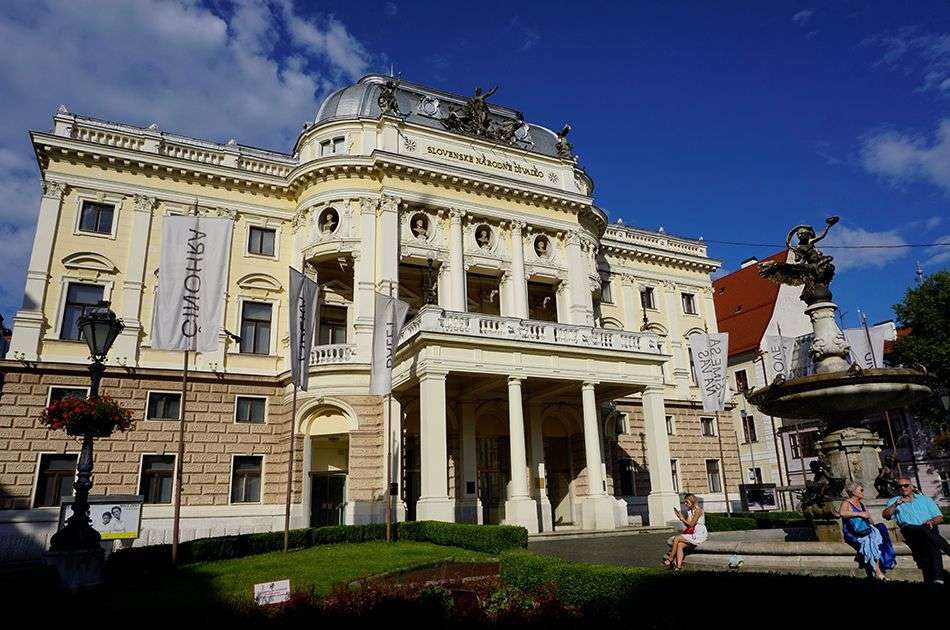 En la misma plaza se encuentra el Teatro Nacional Eslovaco, un grandioso edificio de 1886 con fachada neorrenacentista decorada con los bustos de famosos dramaturgos y compositores. Frente a esta, una escultórica fuente de mármol muestra lo animales que habitaban el Danubio de la época como cangrejos, ranas y tortugas. Con la iluminación nocturna, la plaza parece otro lugar…