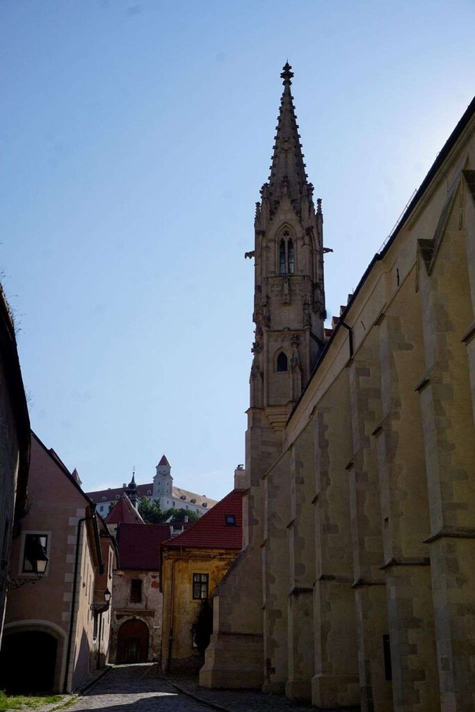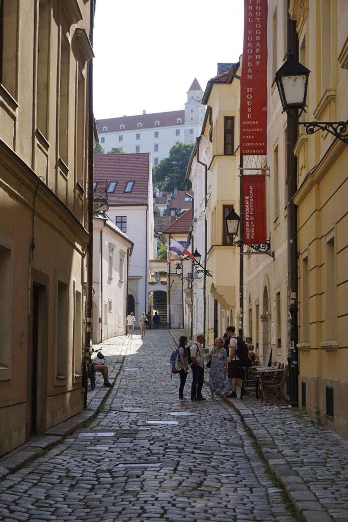 La subida o bajada al castillo caminando, se realiza por calzadas empedradas que descubren encantadores rincones de tascas y tabernas. También se pueden observar los restos de las murallas de Bratislava.