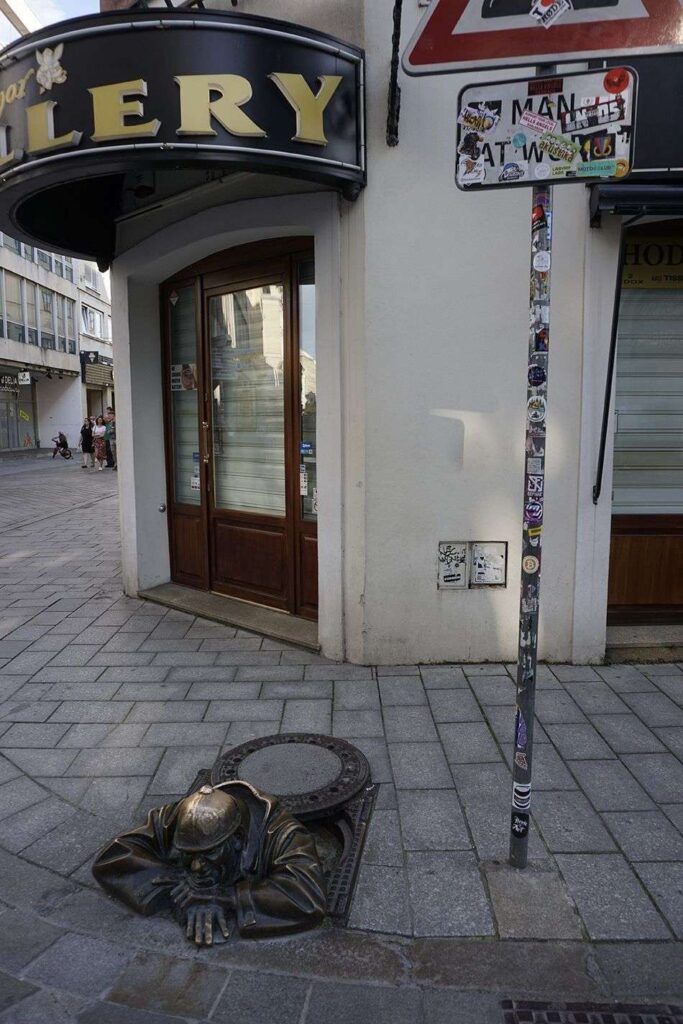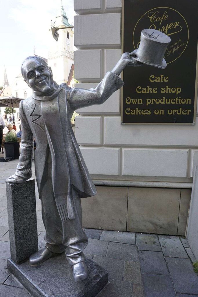 Otro de los atractivos de la ciudad son las originales estatuas de bronce repartidas por el centro histórico. Entre las más famosas, el Čumil, que representa a un trabajador saliendo de una alcantarilla. Curiosamente está señalada con un poste para no tropezar o ser atropellada por un vehículo. Se dice que si tocas su casco te dará suerte. Otra es el Schöne Náci inspirado en un personaje real de principios del siglo XX, Ignác Lamár, del que se cuenta que su mujer lo abandonó, enloqueciendo y saludando desde entonces por las calles con sombrero de copa y frac. Si te colocas bajo su sombrero, ten por seguro que volverás a Bratislava.