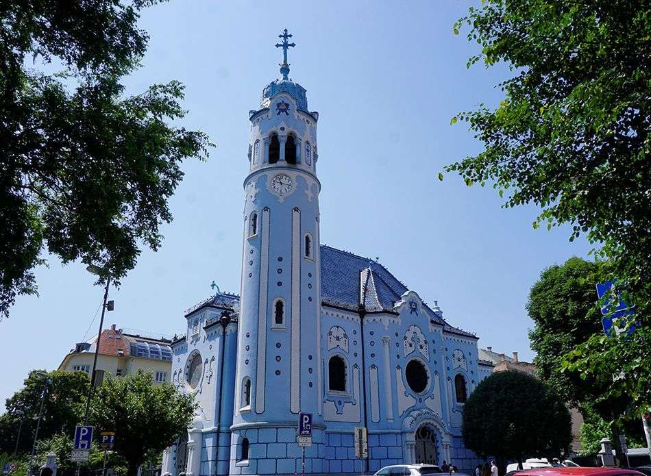 En la calle Bezručova, se halla una joya del “Art Noveau”, la Iglesia de Santa Isabel, en honor a Isabel de Hungría que creció en el castillo. Se la conoce popularmente como la “Iglesia Azul” por el color de sus muros azul pastel. Data de principios del siglo XX y diseñada por Ödön Lechner, un arquitecto conocido como el “Gaudí húngaro”. Es una preciosidad, es azul por fuera y por dentro, nos cuentan que el cura viste de azul, que tiene un coche azul y en algunas bodas los novios visten ¡de azul!. Hay listas de espera de años para poder casarse. Resulta muy vistosa y nos recuerda a una gran tarta.