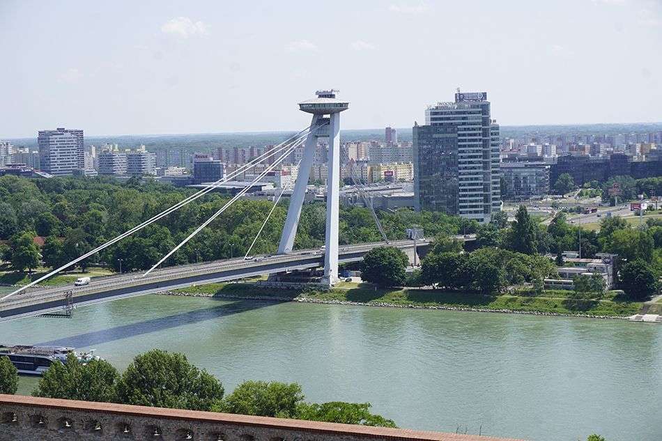 Cruzamos al otro lado del Danubio atravesando el Puente Viejo -que también dispone de carril bici- y en el que hay instalados varios miradores donde recrearse destapando unas de las mejores estampas de Bratislava, con el Danubio, el Castillo, la Catedral y el llamado UFO.