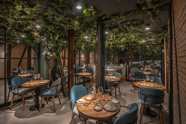También los comensales pueden disfrutar de la comida en el invernadero. Envuelto entre vegetación y espejos, está distribuida en 3 espacios: El viñedo, el salón Rosal y el Patio.
