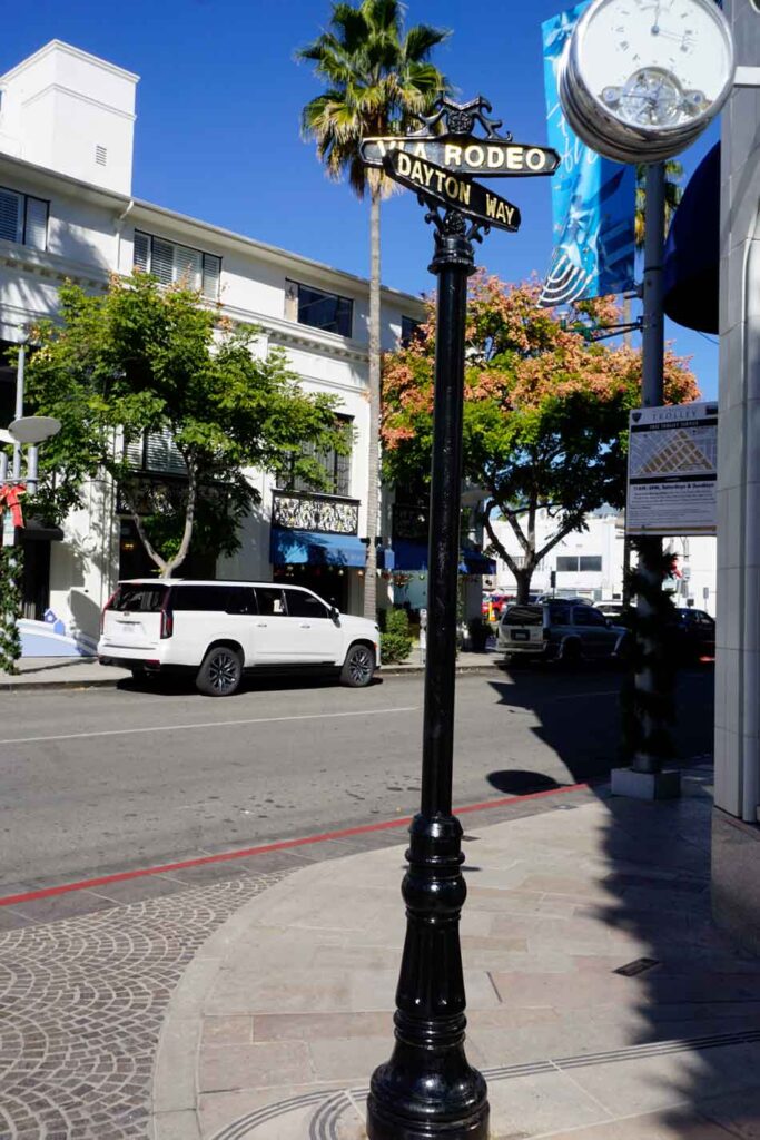 Además de las impresionantes residencias, Beverly Hills alberga Rodeo Drive, la famosa calle comercial conocida por sus boutiques de diseño y joyerías exclusivas. Aparcamos para explorar estas tiendas de lujo, donde la distinción y la opulencia nos dejan boquiabiertos. Las boutiques exhiben las últimas colecciones de diseñadores de renombre mundial y las joyerías deslumbran con sus exquisitas piezas. El ambiente es palpablemente elegante, con visitantes que pasean con bolsas de marcas de lujo y conductores de automóviles de alta gama que recorren lentamente la calle. Estamos muy atentos, ya que al ser el hogar de muchas celebridades, quizá fuera posible ver a alguna de ellas, hecho que no sucedió.