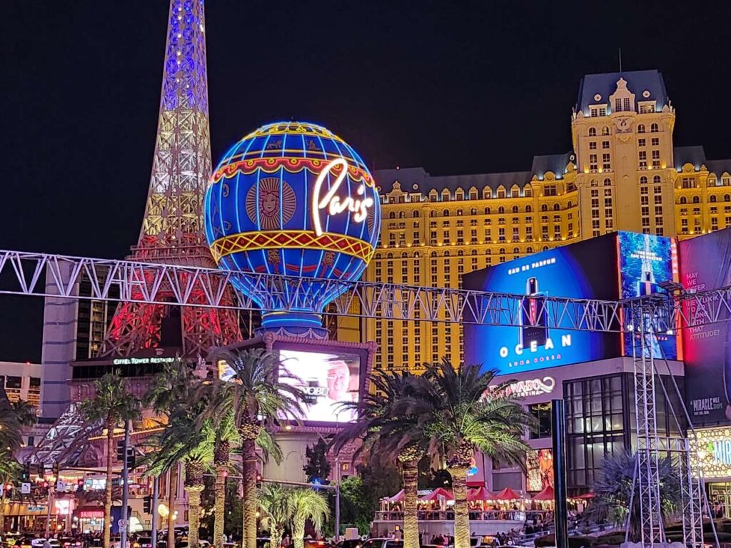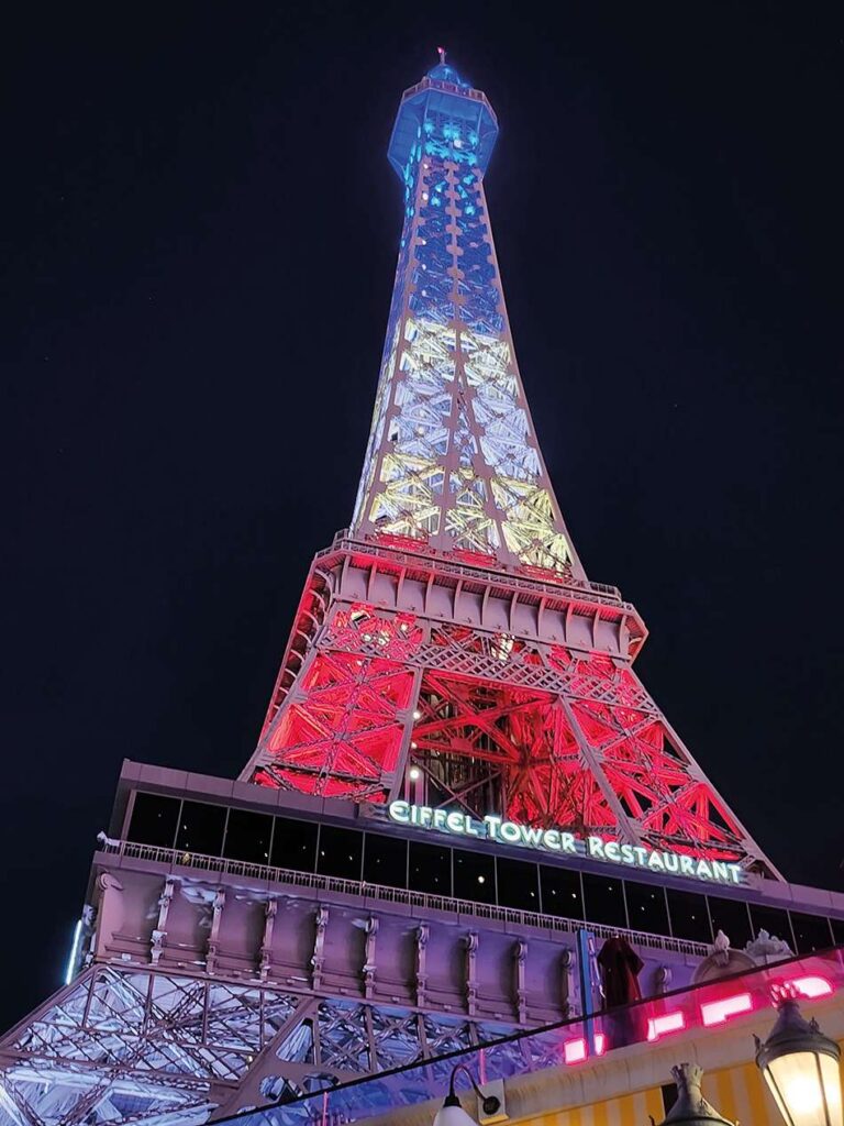 En el Paris Las Vegas, hay una réplica de la Torre Eiffel, el Arco del Triunfo y calles parisinas. Ofrece espectáculos de luces de la Torre Eiffel y shows en vivo en Le Cabaret.