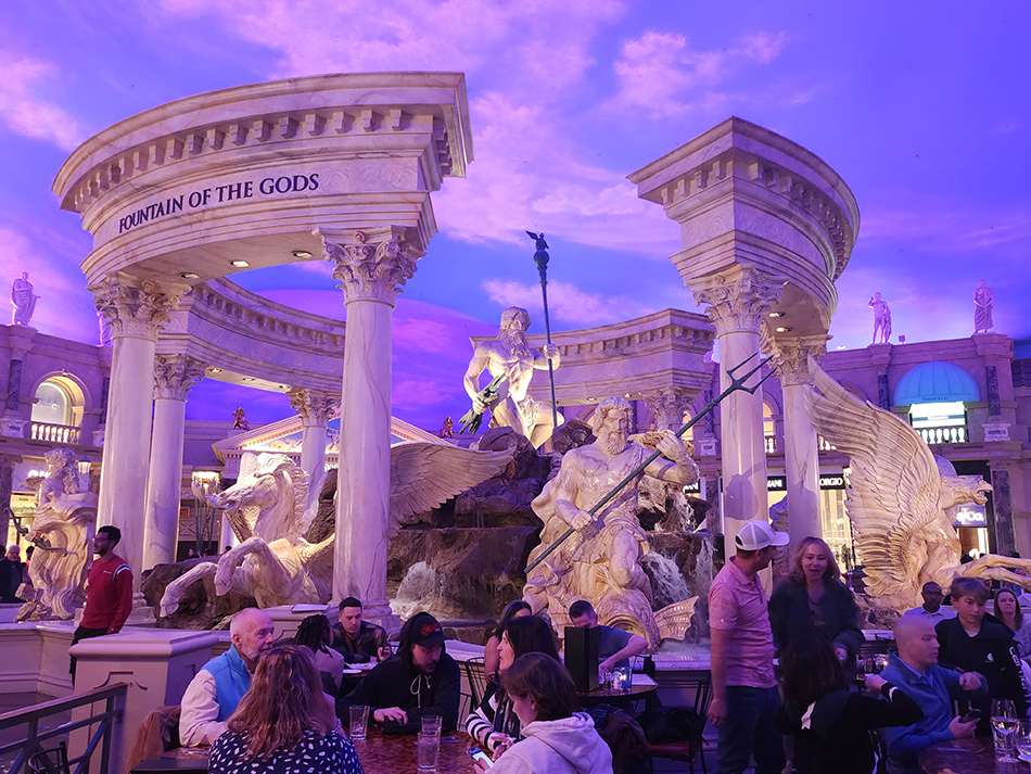 El Caesars Palace, cuya temática es la antigua Roma, alberga dioses romanos, fuentes y arquitectura clásica. Ofrece shows de grandes artistas en el Coliseum, incluyendo conciertos y espectáculos de comedia. Estos son de pago, pero paseando por sus amplios corredores tuvimos la posibilidad de ver la performance de la “Caída de la Atlántida”, una representación gratuita con numerosos efectos especiales. También dispone de un cautivador acuario.