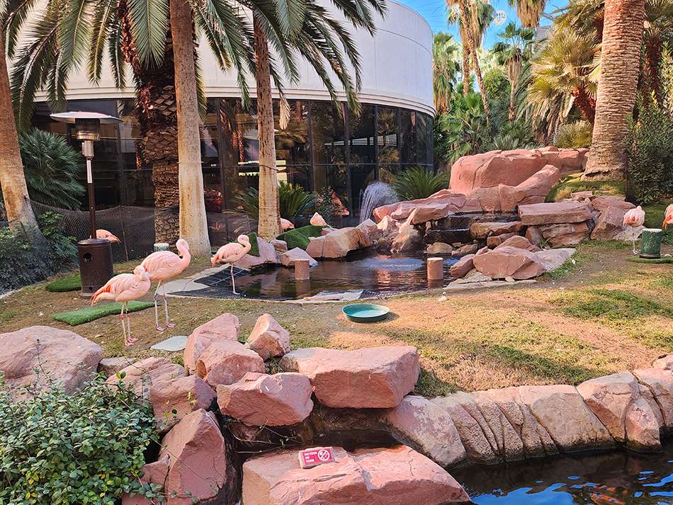 El Flamingo no solo alberga salas de juego y espectáculos; también es un refugio de relajación. Su hábitat de vida silvestre, hogar de hermosos flamencos rosados, tortugas y peces koi, ofrece un respiro tranquilo del bullicio de la ciudad. Los exuberantes jardines tropicales y cascadas crean un ambiente sereno, ideal para un paseo relajante. Es muy recomendable y, sorprendentemente, bastante asequible.