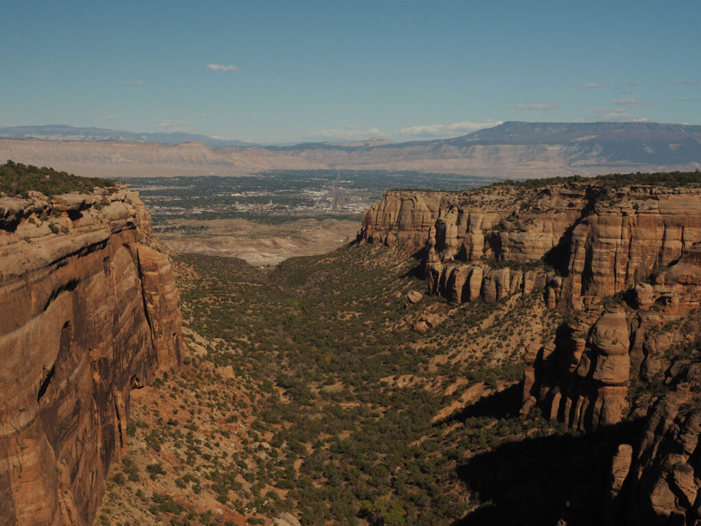 Recorriendo gran parte de esta senda asfaltada y a medida que el sol comenzaba a descender, empezó la magia. Las paredes del gran precipicio se tiñen de tonos cálidos, rojos, naranjas y dorados. Las sombras se alargan, creando contrastes marcados que resaltan las formas rocosas y las capas del cañón. A su vez, la silueta de la luna comienza a vislumbrarse sobre ellas, añadiendo un toque arrebatador.