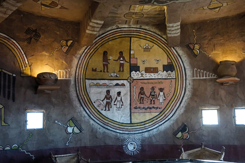 En su interior encontramos murales pintados por el artista Hopi Fred Kabotie, que representan la rica historia, mitología y cultura de los Hopi, ofreciéndonos una profunda conexión con las raíces culturales de la región.