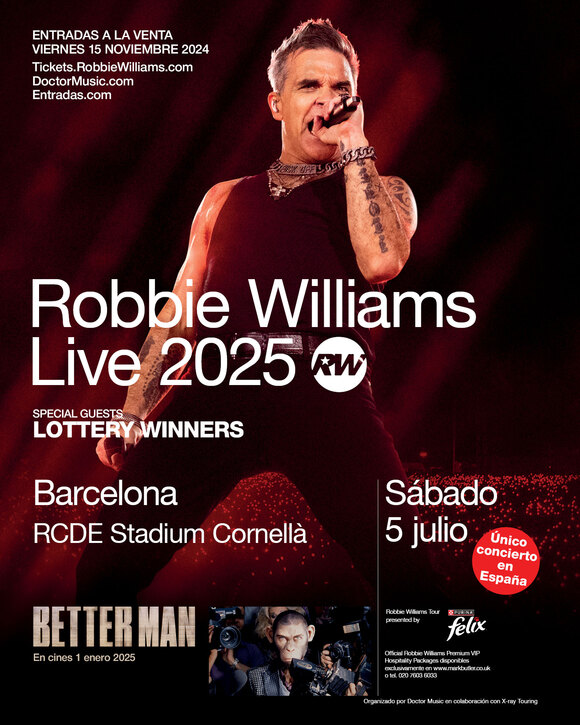El 5 de julio, Robbie ofrecerá un único concierto en España en el RCDE Stadium de Cornellà, Barcelona. Las entradas saldrán a la venta el viernes 15 de noviembre a las 11:00h en doctormusic.com, entradas.com y tickets.robbiewilliams.com.