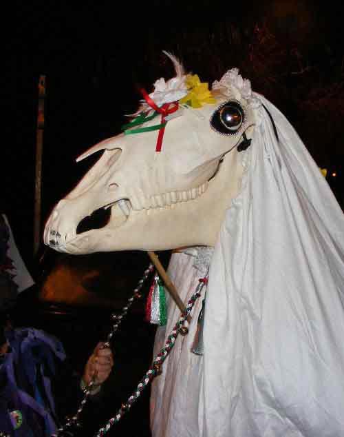 La persona que lleva la Mari Lwyd se esconde debajo de la manta, de modo que la figura parece caminar por sí sola, lo que hace que sea una especie de desfile místico y divertido. Durante esta tradición, el caballo de la Mari Lwyd también se adorna con cintas y campanas.