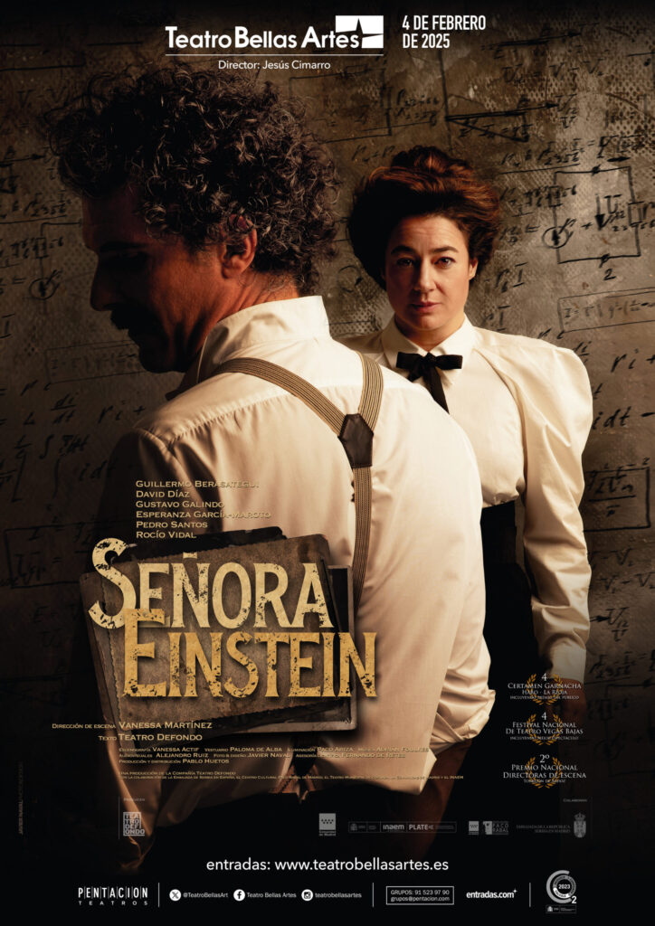 Con dirección de Vanessa Martínez, Señora Einstein es un espectáculo que combina poesía, juego escénico y una crítica contundente al olvido histórico de las mujeres científicas. El reparto está encabezado por Esperanza García-Maroto como Mileva Maric y Gustavo Galindo como Albert Einstein, junto a Guillermo Berasategui, David Díaz, Pedro Santos y Rocío Vidal.