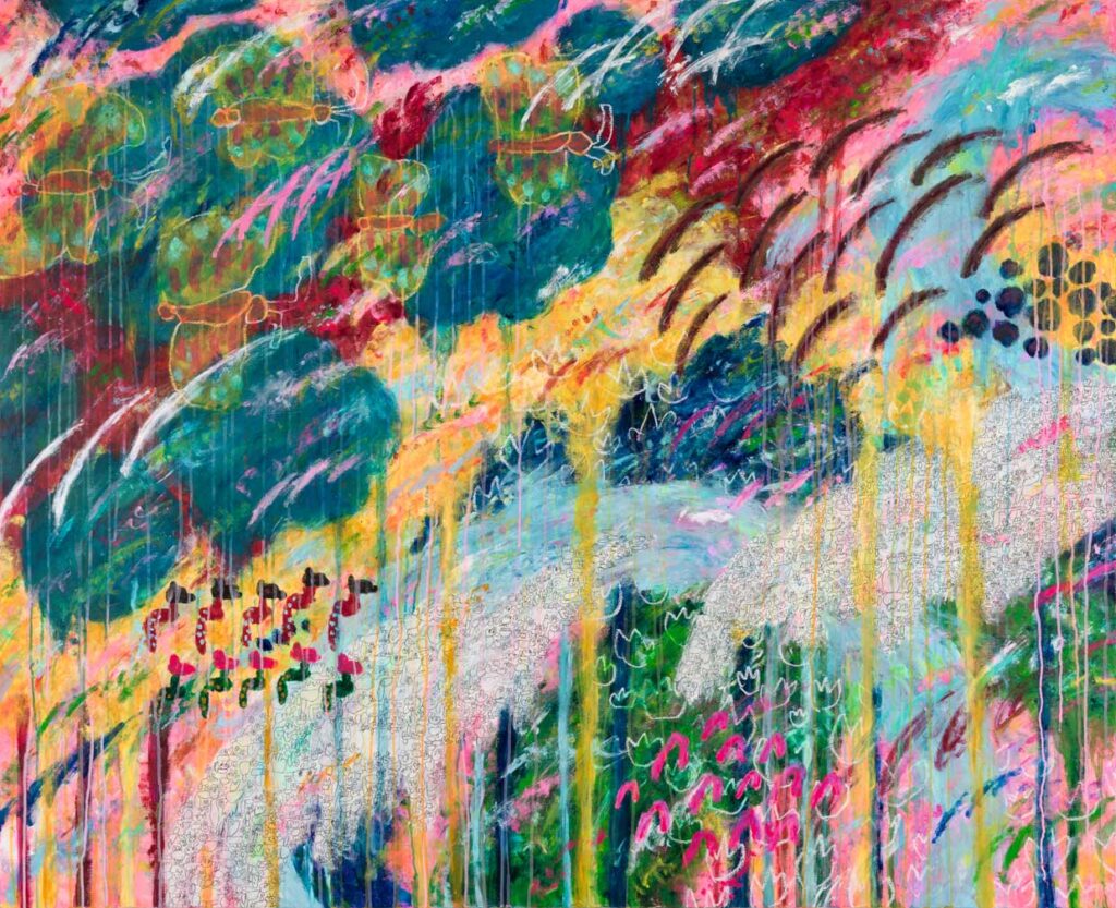 Conocida por su técnica intuitiva y gestual, Rokkaku pinta directamente con las manos, prescindiendo de pinceles, lo que otorga a sus lienzos una energía vibrante y táctil. En sus composiciones habitan figuras flotantes, criaturas que parecen suspenderse entre lo real y lo imaginario. En ellas es posible rastrear la influencia del mono no aware, la sensibilidad japonesa hacia lo efímero, lo que cambia, lo que nunca permanece del todo.