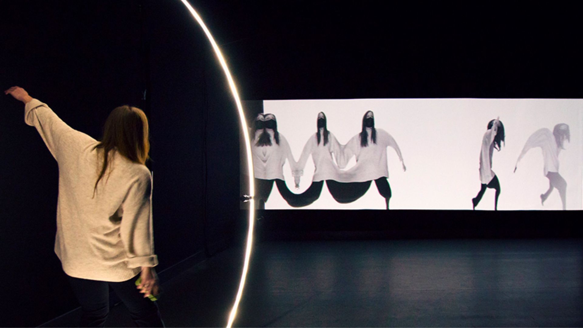 En Nave Una, la instalación interactiva Liminal, del canadiense LP Rondeau, transforma el paso del tiempo en imagen a través de un anillo que captura siluetas y las convierte en proyecciones efímeras.