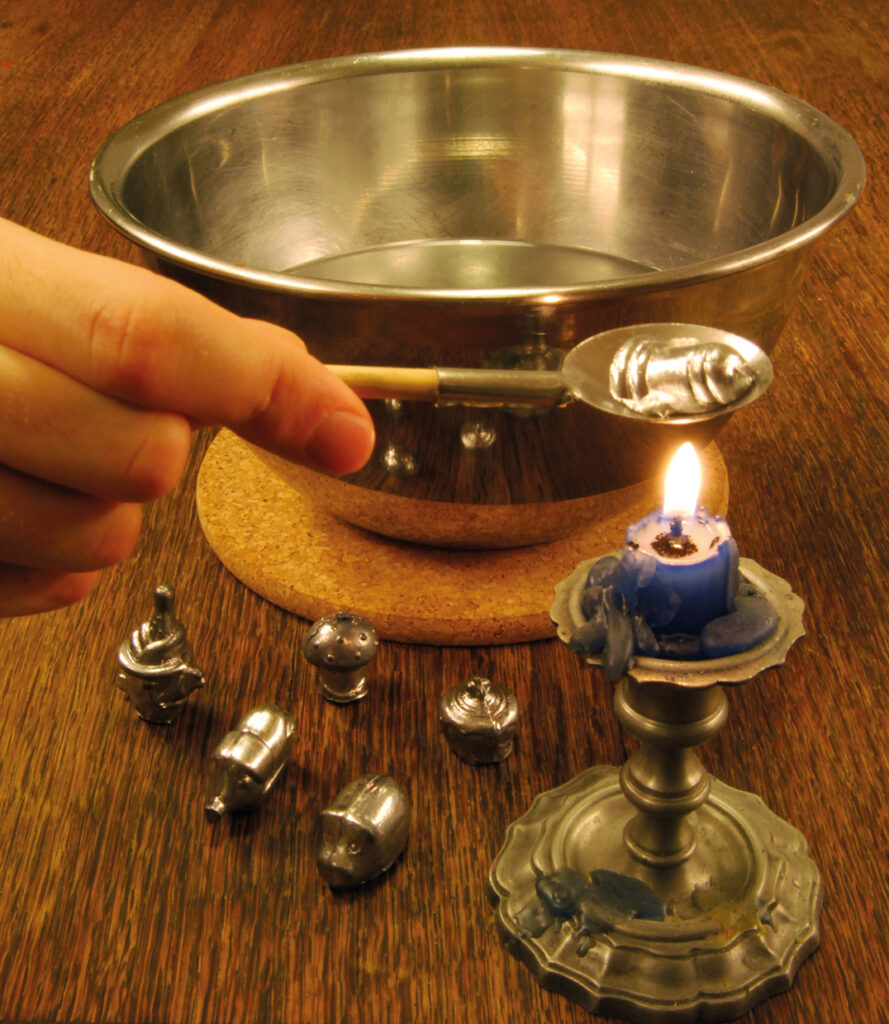 Al producirse el choque térmico del estaño caliente y el agua fría, este metal se solidifica instantáneamente creando formas que se interpretan para hablar de salud, prosperidad, felicidad…